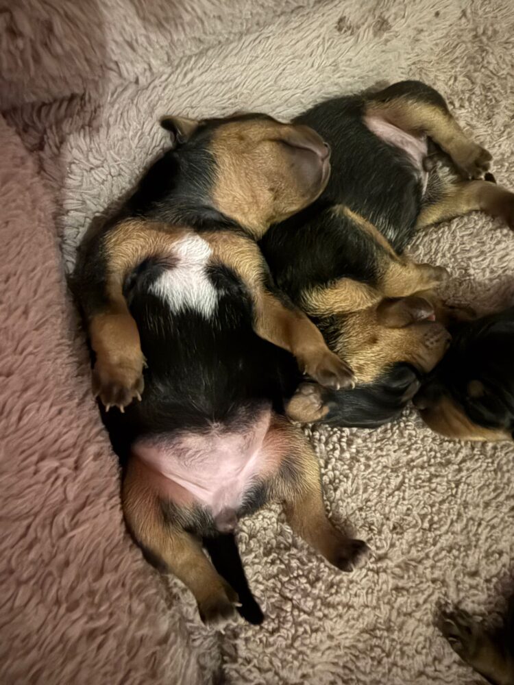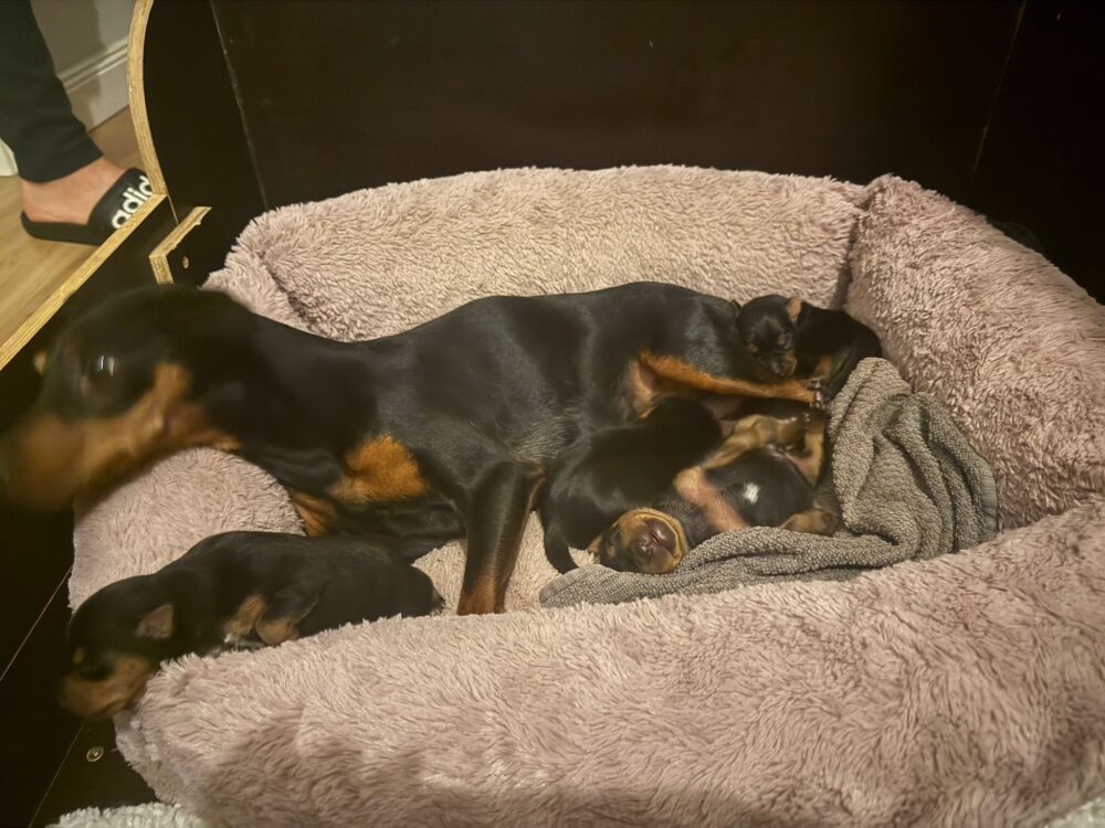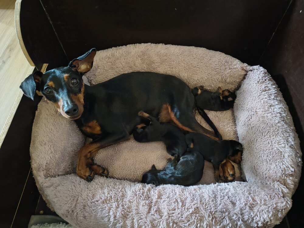 4 Hundewelpen abzugeben! Hallo wir haben am Montag 4 Welpen bekommen. 3 Jungen und ein Mädchen, momentan 430g, 2x 360g und das Mädchen wiegt zur Zeit 360g. Unsere Mama Brenda ist eine reinrassige 2,5 Jahre alte Pinscherdame. Sie ist sehr clever, neugierig, liebevoll und mag ausgiebige Spaziergänge draußen in der Natur. Bei den Welpen wird es sich um einen Pinschermix handeln. Wir wissen aber leider nicht genau, wer der Vater ist, da der Unfall nicht in unserem Beisein passiert ist. Bei Interesse gerne bei uns melden